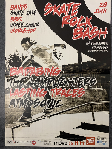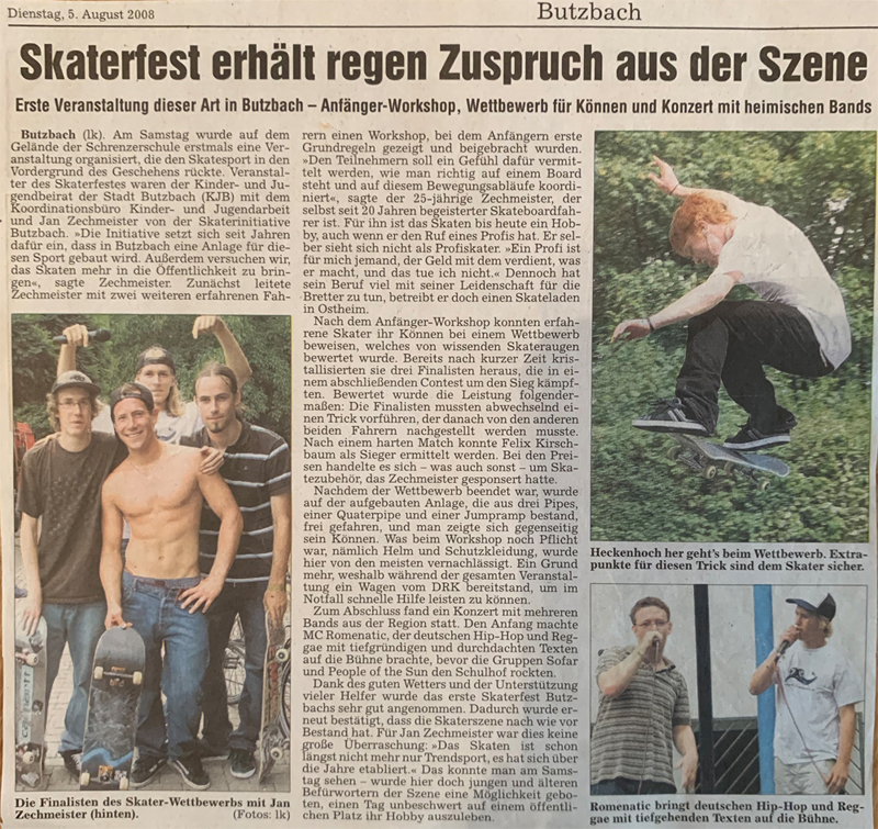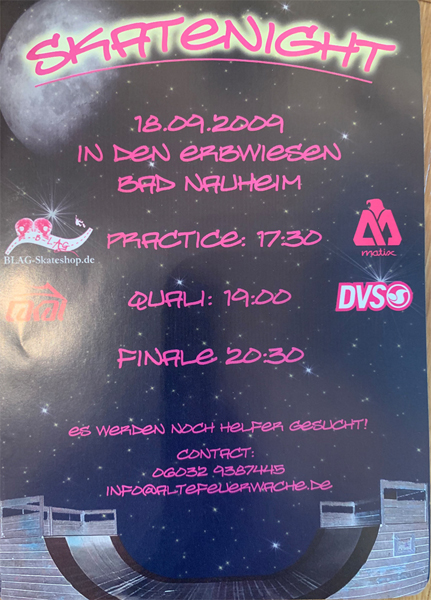 30.08.2026 | Skateboard Anfänger-Workshop auf der Mini-Ramp in der Paul-Ehrlich-Straße, 35510 Butzbach (Nähe Vicus Romanus beim Basketball-Spielfeld) Kursdauer von 13:00 bis 14:00 Uhr, 5,- EUR Teilnehmerbeitrag - Es besteht Helmpflicht! Kostenlose Leihboards und einzelne Knie-, Ellenbogen- und Handgelenkschoner werden wir bereitstellen. |