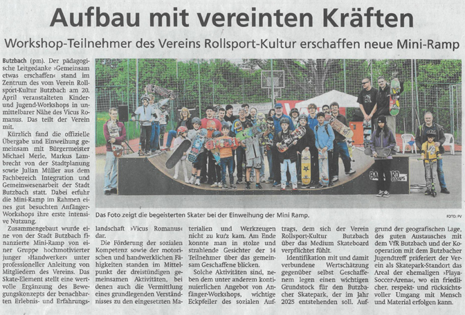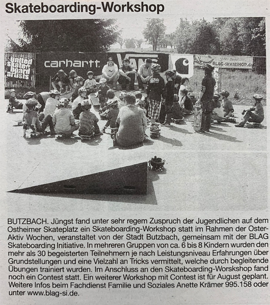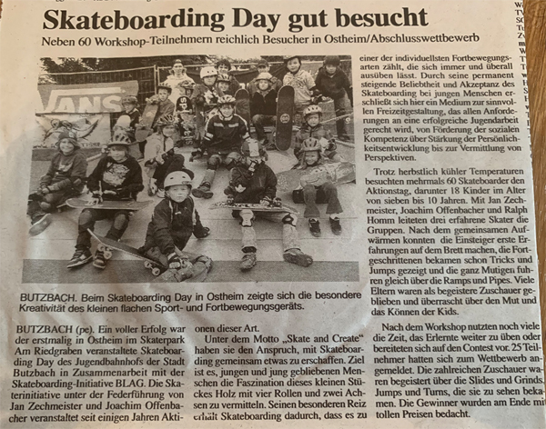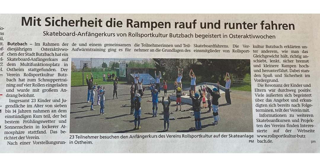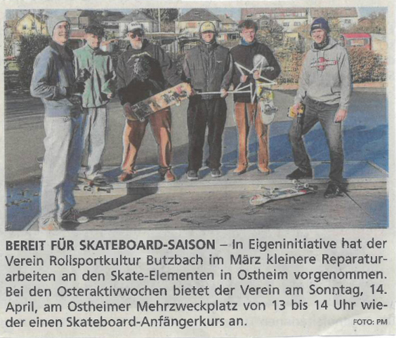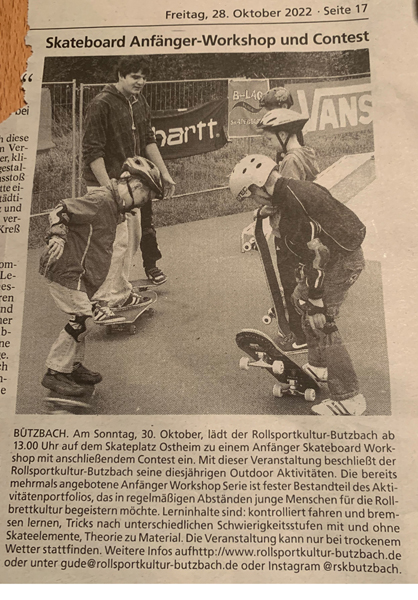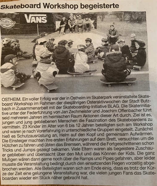 11.04.2026 | Hinweis: Der Skateboard Anfänger-Workshop am Skateplatz Ostheim (Weinstr. 6a) findet wieder innerhalb der Osteraktiv-Wochen der Stadt Butzbach statt. |