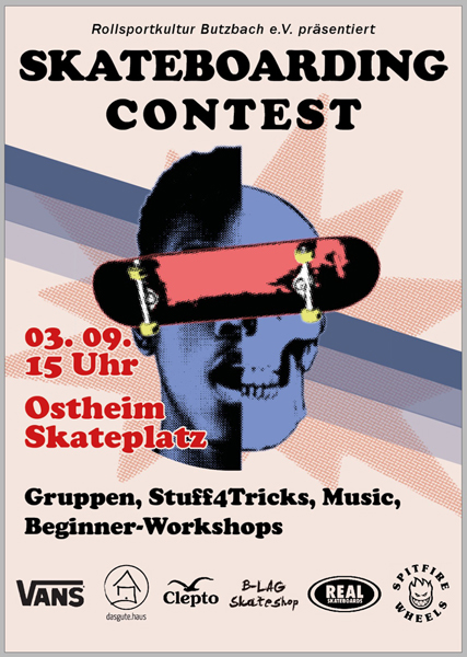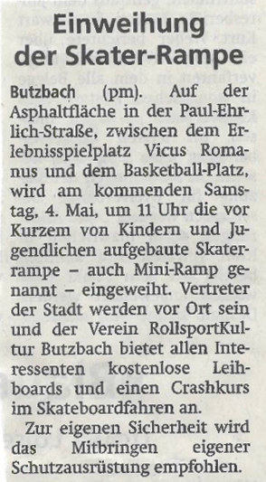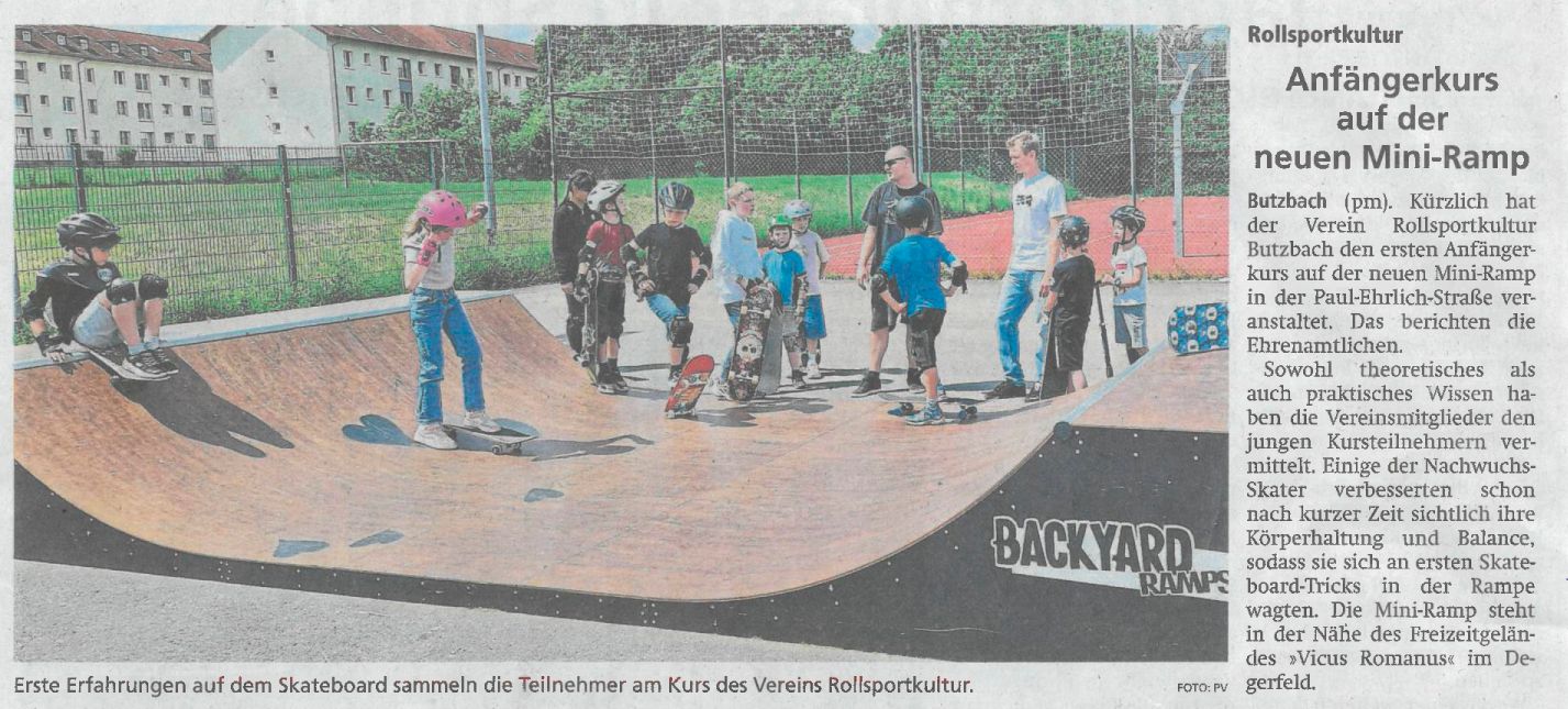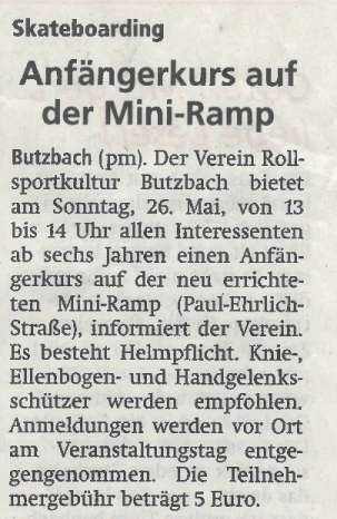 17.05.2026 | Skateboard Anfänger-Workshop auf der Mini-Ramp in der Paul-Ehrlich-Straße, 35510 Butzbach (Nähe Vicus Romanus beim Basketball-Spielfeld) Kursdauer von 13:00 bis 14:00 Uhr, 5,- EUR Teilnehmerbeitrag - Es besteht Helmpflicht! Kostenlose Leihboards und einzelne Knie-, Ellenbogen- und Handgelenkschoner werden wir bereitstellen. |